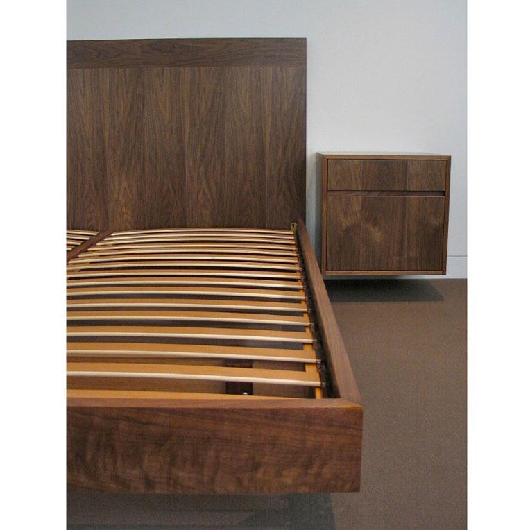This bed is designed to look like it is floating, with recessed legs and the two bedside tables attached to the wall.