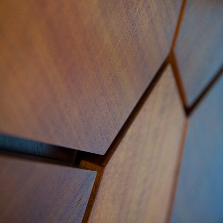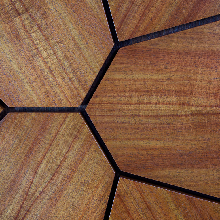 “The geometric shapes incorporated into the piece add a simple complexity to the design. Each of the shapes represents as a cross section of a tree in the lake, as if it were to be sawn off at water level.